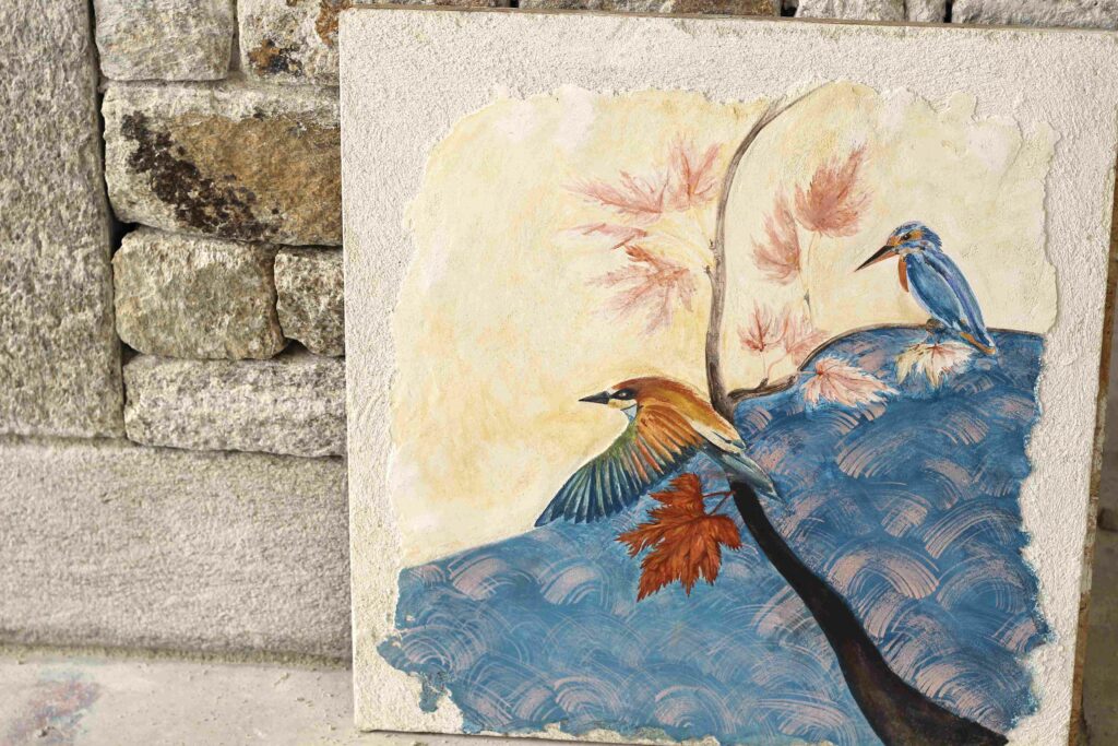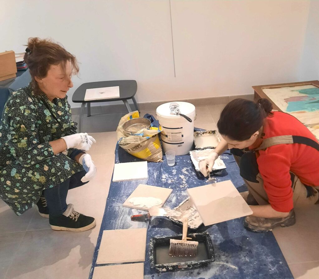 Relier le passé le présent et le futur dans un même atelier, c’est ce que Laurie Dyèvre — Marielle Guille et Thibault Bâton ont réalisés dans ce temps T de la fresque à l’antique — image peinte dans le frais et prise dans la matière carbonatée.