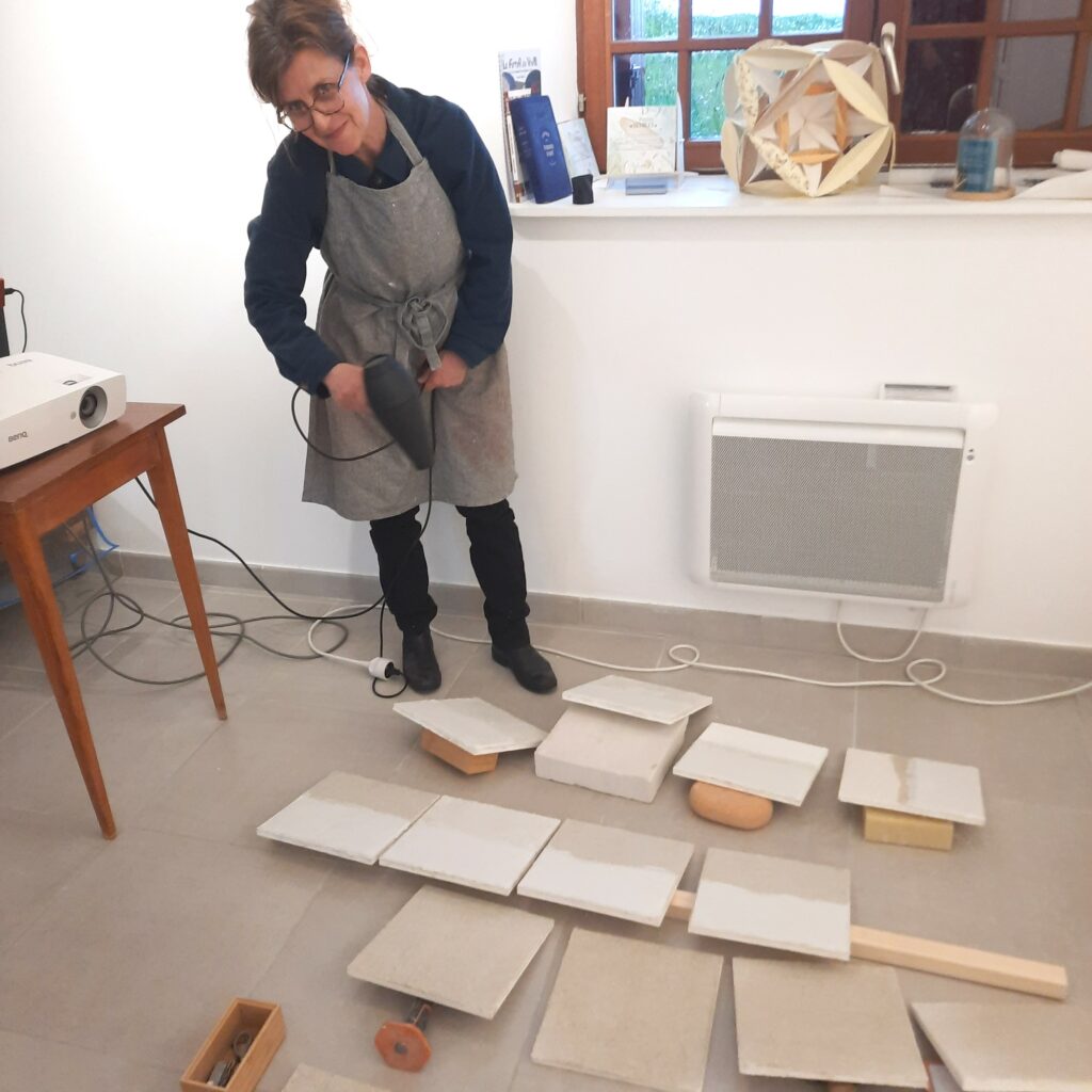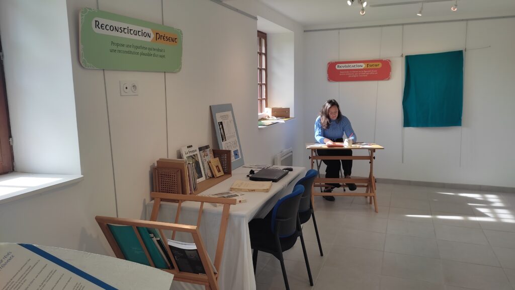 En août à la fête du Moulin en plein été et l’occasion de présenter le projet et une animation en édition reliure pour les publics.
