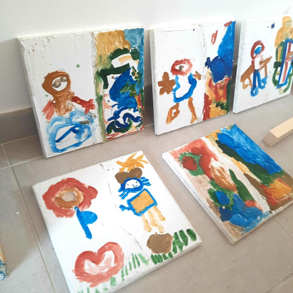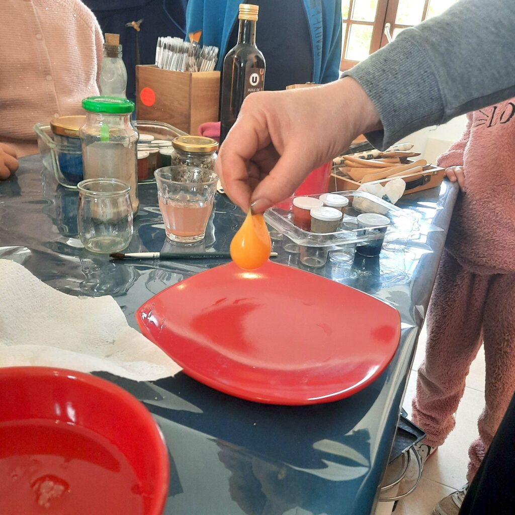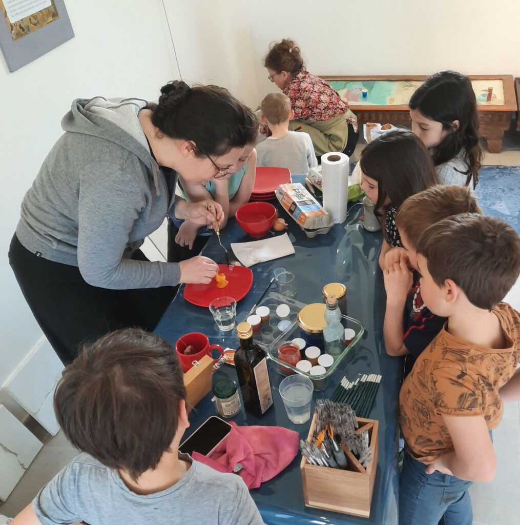 Thibault — J’ai mené deux types d’ateliers avec les enfants de l’école communal. En avril, visite de l’église et de ses fresques, en lien avec l’initiation à la technique a fresco.