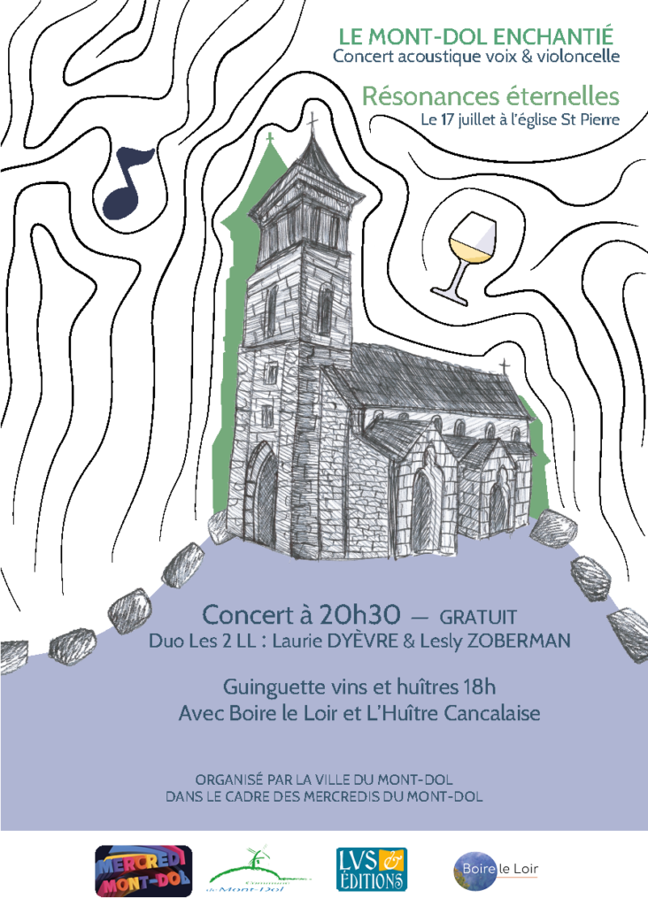 Ce soir du 17 juillet 2024, nous avons le privilège de vous présenter le duo Les 2 LL, qui s’est rencontré pour cette occasion unique. Entre une voix nourrissante pour le cœur et les mélodies profondes du violoncelle, le duo cherche à habiter les espaces, les faire raisonner et vibrer. Dans cette rencontre où voix et violoncelle s’assemblent, Laurie Dyèvre, chanteuse, et Lesly Zoberman, violoncelliste, souhaitent mêler leurs deux cultures musicales aux matériaux de l’église du Mont-Dol, à cet espace acoustique chaleureux et intemporel.