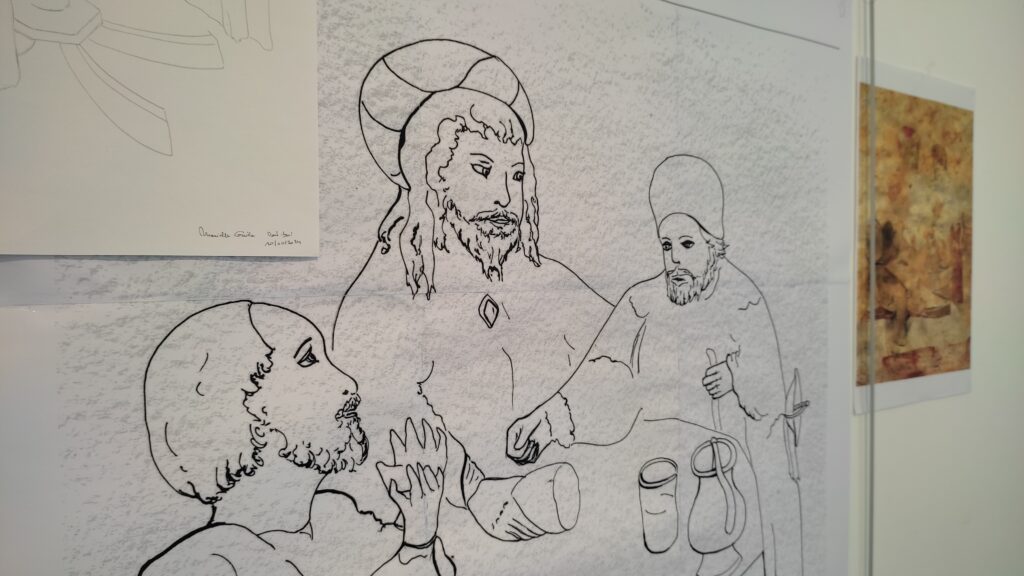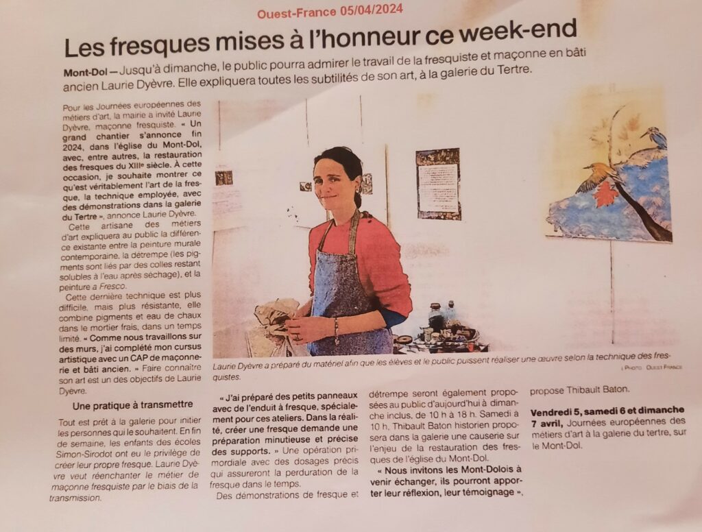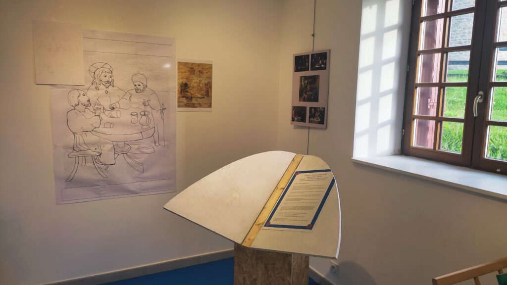 Laurie — Avec des ateliers pour les adultes et enfants 6 jours sur 7 de 10h à 18h, pour découvrir la technique a fresco avec moi, la revisitation avec Marielle Guille et l’historicité de la recherche avec Thibault Bâton, nous avons pu expérimenter les trois différents niveaux du projet — Restauration — Reconstitution — Revisitation et c’est avec cet alliage que nous avons pu proposer au public de réfléchir ensemble, de se projeter, d’imaginer, summum du partage de qualité. Le sujet de choix a été une des fresques de l’église St Pierre « Les pèlerins d’Emmaüs » scène de partage avant tout.